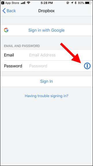 اگر کوئی ایپ آپ کے پاس ورڈ مینیجر کی مدد کرتی ہے تو آپ کو اس کے پاس ورڈ فیلڈ میں یا اس کے آس پاس ایک کیہول یا لاک کا آئیکن نظر آئے گا۔ اس کو تھپتھپائیں اور آپ اپنے پاس ورڈ میں جس طرح استعمال کرسکتے ہو ، اسی طرح ایپ سے وابستہ صارف نام اور پاس ورڈ کو خود سے بھرنے کے ل your اپنے پاس ورڈ مینیجر کی کارروائی کا انتخاب کرسکیں گے۔