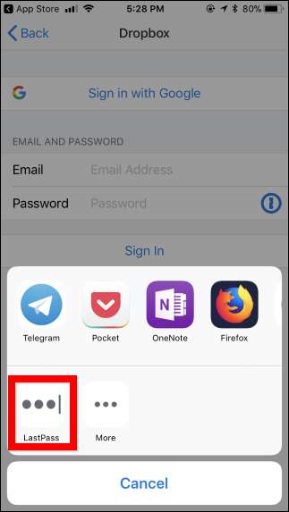 آٹو بھرنا شروع کرنے کے لئے اب آپ شیئر شیٹ پر اپنے پاس ورڈ مینیجر کے آئیکن پر ٹیپ کرسکتے ہیں۔ آپ کا پاس ورڈ مینیجر پہلے آپ کی تصدیق کرے گا ، گویا آپ نے اس کی ایپ کھولی ہے۔ مثال کے طور پر ، لاسٹ پاس استعمال کرسکتے ہیں ٹچ ID یا چہرہ ID اس کے ل.