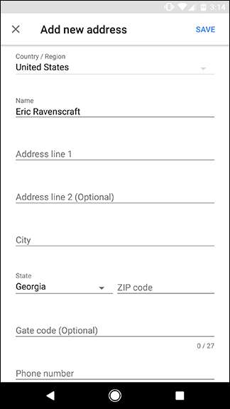اگلا ، آپ کو اپنا شپنگ ایڈریس شامل کرنے کی ضرورت ہوگی۔ ایک بار پھر ، اگر آپ نے اپنے گوگل اکاؤنٹ میں کوئی ایڈریس شامل کرلیا ہے تو ، آپ اسے فہرست میں سے منتخب کرسکتے ہیں ، یا آپ نیا ایڈریس شامل کرسکتے ہیں۔