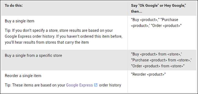 کے مطابق گوگل کی مدد دستاویزات ، اگر آپ کسی مخصوص کمپنی سے اپنی بیٹریاں پسند کرتے ہیں تو آپ اسٹور بھی مخصوص کرسکتے ہیں۔ محض اپنے پسندیدہ اسٹور سے نتائج حاصل کرنے کے لئے "فرائی سے بیٹریاں خریدیں" کا کہنا ہے۔ اگر آپ نے پہلے ہی کوئی شے خرید لی ہے ، تو پھر اسی ترتیب کو بحال کرنے کے لئے آپ "بیٹریوں کو دوبارہ ترتیب دینا" بھی کہہ سکتے ہیں۔ مذکورہ چارٹ کو صوتی کمانوں کی پوری حد کے لئے دیکھیں جس کا استعمال آپ Google ہوم سے آرڈر کرسکتے ہیں۔