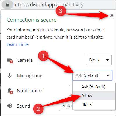 ظاہر ہونے والے مینو میں سے ، مائکروفون یا کیمرا پر کلک کریں ، پھر ڈراپ ڈاؤن مینو سے ، "اجازت دیں" یا "مسدود کریں" کو منتخب کریں ، اور پھر اپنی تبدیلیوں کو محفوظ کرنے کے لئے X پر کلک کریں۔