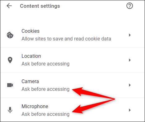 اگرچہ آپ عالمی سطح پر کروم سے انکار نہیں کرسکتے ہیں — یا اس معاملے کے ل grant ، آپ کے کیمرا اور مائیکروفون تک ہر طرح کی رسائی حاصل کرسکتے ہیں لیکن اگر آپ کو اس کے بجائے فیصلہ کرنے کا اشارہ نہیں کیا جاتا ہے تو ، "مائکروفون" یا "کیمرہ" میں واپس جائیں۔ کروم کے مشمولات کی ترتیبات۔