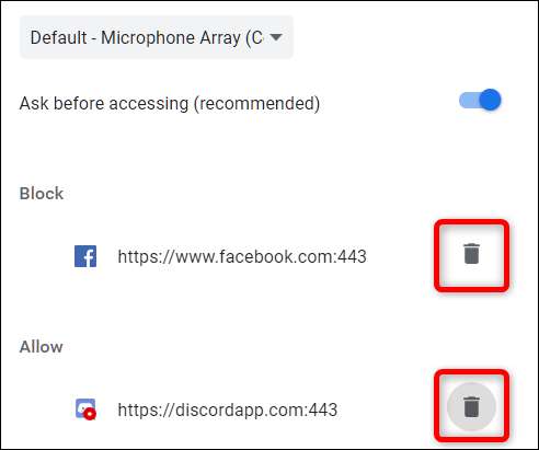 اگرچہ آپ دستی طور پر کسی سائٹ کو ترتیبوں سے اجازت یا بلاک لسٹ میں دستی طور پر شامل نہیں کرسکتے ہیں ، لیکن آپ اس صفحے پر جس سائٹ تک رسائی کی اجازت یا تردید کی ہے اس کی ایک فہرست آپ دیکھ سکتے ہیں۔ پھر ان آئٹمز کو ہٹانے کے لئے جن کی آپ نے پہلے اجازت دی ہے یا رسائی کو مسدود کردیا ہے ، آپ سبھی کو سائٹ کے ساتھ لگے ہوئے کوڑے دان کے آئکن پر کلک کرنا ہے۔