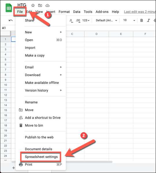 ایسا کرنے کے لئے، آپ کے اسپریڈ شیٹ کھولیں Google چادریں اور فائل اور GT دبائیں؛ سپریڈ شیٹ کی ترتیبات.