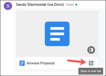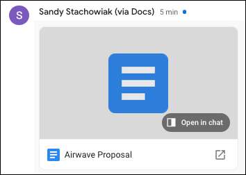 دستاویز پر مشتمل کمرے میں سر پیچھے. آپ دستاویز سے ذرا پہلے کی طرح چیٹ میں اسے کھولنے کے لئے کلک کر سکتے ہیں. آپ کو بھی جس Docs، شیٹس، یا سلائیڈیں سائٹ پر دستاویز پر لے جاتا ہے ایک نئی ٹیب میں کھول سکتے ہیں.