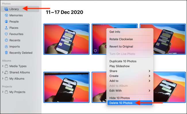 تصاویر اپلی کیشن میں، "لائبریری" ٹیب پر جائیں اور اس تصاویر کو منتخب کریں جو آپ حذف کرنا چاہتے ہیں. پھر، صحیح کلک کریں اور "حذف تصاویر" کے بٹن کو منتخب کریں. متبادل طور پر، آپ اپنی کی بورڈ پر حذف کرنے کی کلید استعمال کرسکتے ہیں.
