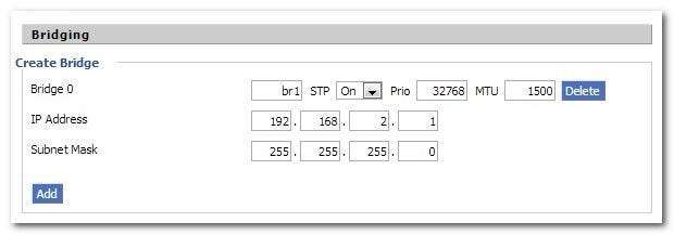 پہلے ابتدائی سلاٹ کو "br1" میں تبدیل کریں ، باقی اقدار کو وہی چھوڑیں۔ ابھی ابھی آپ نے اوپر دیکھا ہوا IP / سب نیٹ اندراج نہیں دیکھ پائیں گے۔ "ترتیبات کا اطلاق کریں" پر کلک کریں۔ نیا پل برجنگ سیکشن میں ہوگا جس میں آئی پی اور سب نیٹ سیکشن دستیاب ہیں۔ IP ایڈریس کو اپنے باقاعدہ نیٹ ورک کے IP سے دور رکھنے کے لئے مقرر کریں (جیسے آپ کا بنیادی نیٹ ورک 192.168.1.1 ہے ، لہذا اس قدر کو 192.168.2.1 بنائیں)۔ 255.255.255.0 پر سب نیٹ ماسک سیٹ کریں۔ صفحے کے نچلے حصے میں دوبارہ "ترتیبات کا اطلاق کریں" پر کلک کریں۔