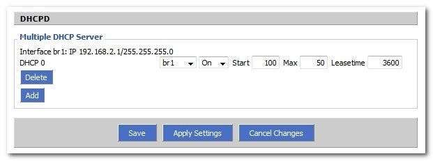 تبدیلیاں لاگو ہونے کے بعد ، ایک بار پھر پیج کے نچلے حصے تک DHCPD سیکشن پر سکرول کریں۔ "شامل کریں" پر کلک کریں۔ پہلا سلاٹ "br1" میں تبدیل کریں۔ باقی ترتیبات کو وہی چھوڑ دیں (جیسا کہ ذیل میں اسکرین شاٹ میں دیکھا گیا ہے)۔