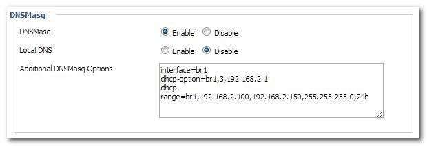 سروسز سیکشن میں ہمیں DNSMasq سیکشن میں تھوڑا سا کوڈ شامل کرنے کی ضرورت ہے تاکہ راؤٹر مہمان نیٹ ورک سے جڑنے والے ڈیوائسز کو متحرک IP ایڈریسز کو مناسب طریقے سے تفویض کرے۔ DNSMasq سیکشن نیچے سکرول کریں۔ "اضافی DNSMasq آپشنز" باکس میں ، درج ذیل کوڈ کو چسپاں کریں (ہر لائن کی فعالیت کی وضاحت کرتے ہوئے مائنس # کمنٹس):