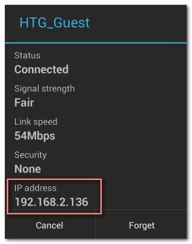 چاہے آپ نے ایک یا دو تکنیک کا استعمال کیا ہو ، اپنے نئے مہمان SSID سے مربوط ہونے کے لئے کچھ منٹ انتظار کریں۔ جب آپ مہمان SSID سے مربوط ہوتے ہیں تو ، اپنا IP پتہ چیک کریں۔ ہم نے مندرجہ بالا کے ساتھ جو حد بیان کی ہے اس میں آپ کا ایک IP ہونا چاہئے۔ ایک بار پھر ، یہ چیک کرنے کے لئے آپ کے اسمارٹ فون کا استعمال کرنا آسان ہے:
