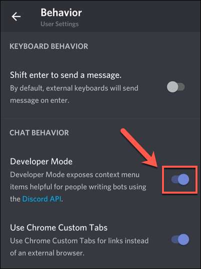 "رویے" مینو میں، "ڈیولپر موڈ" کا اختیار کے ساتھ دیئے سلائیڈر نل. سلائیڈر بھوری رنگ ہے، تو ترتیب غیر فعال ہے. آپ ڈیولپر موڈ کو چالو کرنے کے لئے چاہتے ہیں، سلائیڈر نیلا ہے اس بات کو یقینی بناتے ہیں.