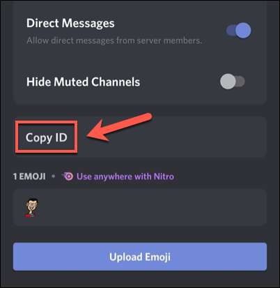 اختلاف ڈیولپر موڈ فعال کے ساتھ، آپ کے سرورز، چینلز، صارفین، اور انفرادی پیغامات کے لیے آئی ڈیز کاپی کرنے کے قابل ہو جائے گا. ، سرورز کے لئے ایسا سرور نام پر ٹیپ کرنے کے لئے، پھر "کاپی ID" اختیار منتخب کریں.
