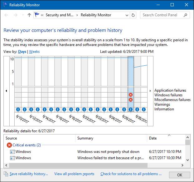 قابل اعتماد مانیٹر ونڈو کا اہتمام حالیہ دنوں میں دائیں طرف کالموں کے ساتھ تاریخوں کے ذریعہ کیا جاتا ہے۔ آپ پچھلے کچھ ہفتوں سے واقعات کی تاریخ دیکھ سکتے ہیں ، یا پھر آپ ہفتہ وار منظر میں تبدیل ہو سکتے ہیں۔ ہر دن کے کالم میں اس دن کے لئے ریکارڈ کردہ واقعات دکھائے جاتے ہیں۔