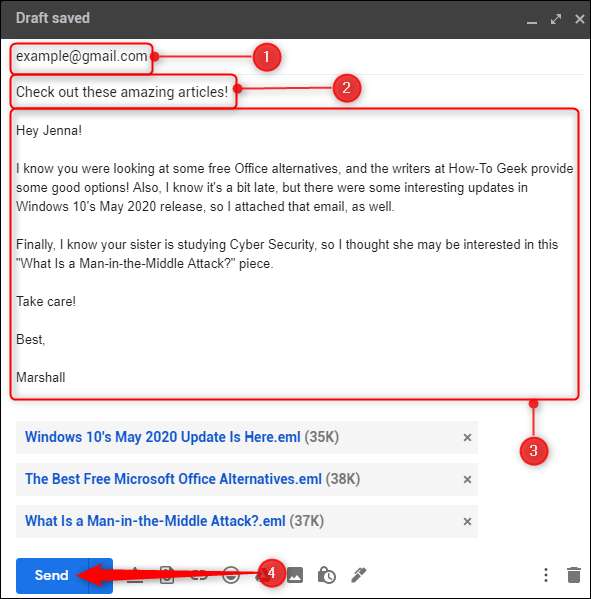 ای میل کی طرف سے (1) وصول کنندہ کو شامل کرنا، (2) ای میل کو ایک موضوع دے، اور (3) اپنا پیغام ٹائپ کریں جسم میں.