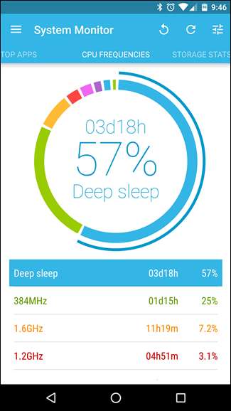 سسٹم مانیٹر ( مفت , کے لئے ) ، Android ، کے نظام کی نگرانی کے لئے میری پسندیدہ ایپس میں سے ایک ہے۔ اگرچہ یہ بہت سی مختلف چیزیں کرسکتا ہے ، ہم صرف آج ایک پر توجہ مرکوز کر رہے ہیں: سی پی یو تعدد پر نگاہ رکھنا۔ اس سے پروسیسر کی سب سے زیادہ استعمال شدہ فریکوئنسی states 1.2GHz ، 384MHz ، وغیرہ پر نگاہ پڑتی ہے — اور پھر پتہ چلتا ہے کہ سی پی یو ہر ریاست میں کتنا وقت خرچ کرتا ہے۔