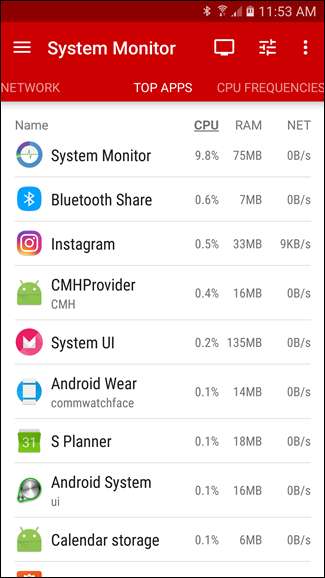 اچھی خبر یہ ہے کہ سسٹم مانیٹر بھی اس میں مدد فراہم کرسکتا ہے ، (حالانکہ اس کام کے ل for بہتر ایپس موجود ہیں ، اور ہم بعد میں ان پر تبادلہ خیال کریں گے)۔ سی پی یو فریکوئینسی ٹیب کے دائیں طرف ایک سوائپ "ٹاپ ایپس" ویو ہے ، جو آپ کو دکھاتا ہے کہ کون سے ایپس اصل وقت میں زیادہ سرگرم ہیں۔ سرفہرست ایپ ہمیشہ سسٹم مانیٹر ہی ہوتا ہے ، کیونکہ یہ پیش منظر کی ایپ ہے۔ اس کے نیچے اچھالنے والی یہ چیزیں ہیں جسے آپ قریب سے دیکھنا چاہتے ہیں۔