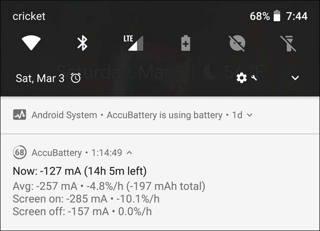 ایکو بیٹری ایک آسان نوٹیفکیشن میں آپ کی بیٹری کے بارے میں فوری ، مفصل معلومات پیش کرتی ہے جس میں موجودہ وقت باقی رہ جاتا ہے (تخمینہ کے طور پر ، ظاہر ہے) ، خارج ہونے والے مادہ کی شرح ، اور کتنی بیٹری (اسکرین آف) کے ساتھ (ایم اے ایچ میں) استعمال ہوتی ہے۔ مؤخر الذکر میں فی گھنٹہ بیٹری کے استعمال کی فیصد بھی شامل ہے۔ جیسا کہ میں نے کہا ، یہ بہت کمپیکٹ پیکیج میں بہت سی معلومات ہے۔