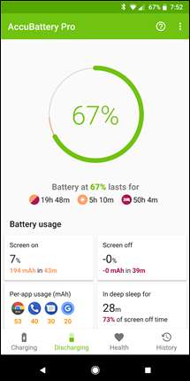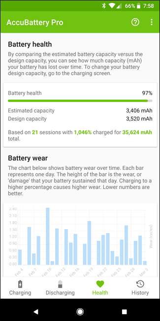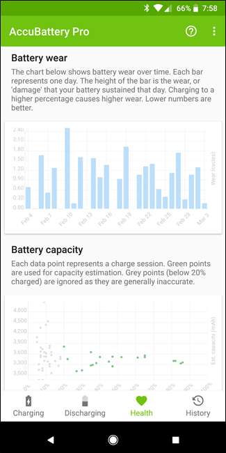 تفصیلات خارج کرنے کے علاوہ ، آپ اپنی بیٹری کی صحت سے متعلق مزید معلومات بھی حاصل کرسکتے ہیں۔ جبکہ ہمارے پاس ایک مکمل رہنما موجود ہے جس کا احاطہ کیا گیا ہے اپنے آلہ کی بیٹری کی صحت کا تعین کرنے کے ل Acc کسبیٹری کو کس طرح استعمال کریں ، خلاصہ یہ ہے۔ جب تک آپ اپنے فون کو ایکیو بیٹری انسٹال کرتے ہیں اس کا استعمال اتنا ہی درست ہوجاتا ہے۔ صحت کے اعدادوشمار کا تعین کرنے میں وقت درکار ہوتا ہے ، لہذا آپ ایپ کو انسٹال کرنے کے بعد ، اپنے فون کو ایسے ہی استعمال کریں جیسے آپ عام طور پر کریں گے۔ ایکو بیٹری پس منظر میں چلتی ہے ، موجودہ چارج اور خارج ہونے والے مادہ کی شرحوں کے ساتھ ساتھ بیٹری پہننے ، صلاحیت اور مجموعی صحت کا بھی حساب لگاتی ہے۔
