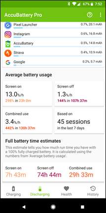 - بیٹری کا مکمل تخمینہ: آپ کی بیٹری اسکرین آن ، اسکرین اسکرین اور مشترکہ استعمال کیلئے پورے معاوضے پر کتنی دیر تک چلے گی
