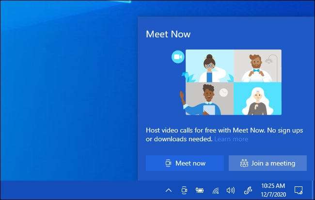 اب ملاقات آئکن اس سے اوپر مڑے ہوئے لائنوں کے ساتھ ایک چھوٹا سا ویڈیو کیمرے کی علامت کی طرح لگ رہا ہے. پہلے سے طے شدہ طور پر، یہ ونڈوز 10 ٹاسک بار کے نوٹیفکیشن کے علاقے میں ظاہر ہوتا ہے.