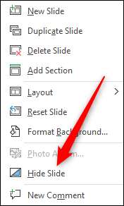 ایک بار یہ منتخب کیا جاتا ہے، سلائڈ پر دائیں کلک کریں. سیاق و سباق کے مینو میں، "سلائڈ چھپائیں" کا انتخاب کریں.