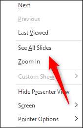 پیشکش کے دوران، موجودہ سلائڈ پر کہیں بھی صحیح کلک کریں. ظاہر ہوتا ہے کہ سیاق و سباق مینو میں، "تمام سلائڈ دیکھیں" منتخب کریں.