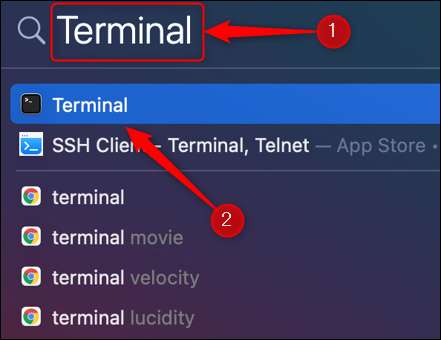 اسپاٹ لائٹ تلاش بار ظاہر ہو جائے گا. ٹائپ کریں "ٹرمینل،" اور پھر واپسی کی کلید دبائیں یا تلاش کے نتائج میں "ٹرمینل" پر کلک کریں.