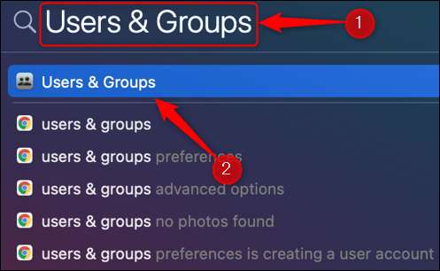 اس سے پہلے کہ ہم ٹائپنگ آرڈر شروع کریں، آپ کو آپ کے صارف کی شناخت کو جاننے کی ضرورت ہوگی. اسے تلاش کرنے کے لئے، اوپن اسپاٹ لائٹ تلاش (ڈیسک ٹاپ کے مینو بار میں میگنفائنگ گلاس آئکن پر کلک کریں یا کمانڈ + جگہ پر دبائیں) اور "صارفین اور amp؛ گروپ "تلاش کے بار میں. واپسی کی کلید دبائیں یا "صارفین اور AMP پر کلک کریں؛ گروپ "تلاش کے نتائج میں.