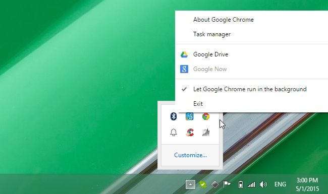 عام طور پر کروم پس منظر میں چل رہا ہے ، یہاں تک کہ آپ اسے بند کرنے کے بعد بھی۔ اگر آپ ونڈوز پر موجود ہیں تو آپ کو اپنے سسٹم ٹرے میں تھوڑا سا کروم آئیکن نظر آئے گا - ہوسکتا ہے کہ اس تیر آئیکون کے پیچھے دفن ہوسکے۔ اپنے تمام کروم ونڈوز کو بند کردیں اور خود کروم بھی پس منظر میں چلتا رہے گا۔