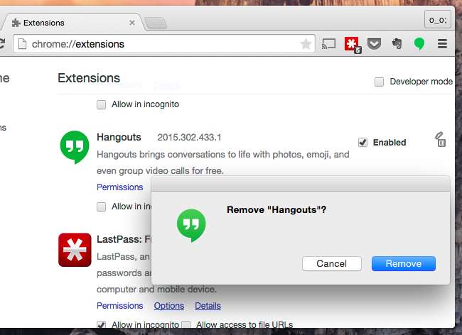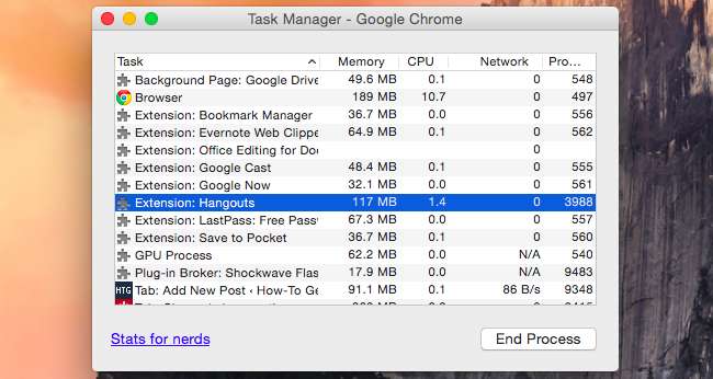 مثال کے طور پر ، یہاں ہم دیکھ سکتے ہیں کہ سرکاری طور پر گوگل ہانگس ایکسٹینشن 100 ایم بی سے زیادہ کی رام استعمال کررہی ہے۔ صرف یہی نہیں - یہ کمپیوٹر کے 1 سے 2 فیصد سی پی یو کا مستقل استعمال کررہا ہے ، لہذا یہ بھی بیٹری کی طاقت کو غیر ضروری طور پر ختم کررہا ہے۔ اس طرح کی توسیع کو غیر انسٹال کرنا ایک اچھا خیال ہے ، جب تک کہ واقعی آپ کو اس کی ضرورت نہ ہو۔