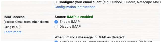 اب، سر Gmail. اور لاگ ان کریں. اسکرین کے سب سے اوپر پر "ترتیبات" کوگ آئیکن پر کلک کریں، اس کے بعد "تمام ترتیبات دیکھیں." "فارورڈنگ اور پاپ / IMAP" ٹیب پر، اس بات کو یقینی بنائیں کہ "IMAP کو فعال کریں" پر یہ ہے کہ "حیثیت" کے علاقے "IMAP فعال" پڑھا ہے "سبز متن میں.