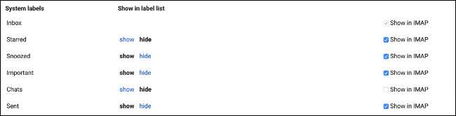 "لیبل" ٹیب پر، اس بات کو یقینی بنائیں کہ آپ کسی بھی لیبل کو فعال کرتے ہیں جو آپ ان کو "IMAP میں دکھائیں" کے طور پر چیک کرکے ظاہر کرنا چاہتے ہیں. اگر آپ کچھ لیبلز (جیسے چیٹ کی طرح) منتقل کرنے سے بچنے کے لئے چاہتے ہیں تو انہیں غیر فعال کرنا.