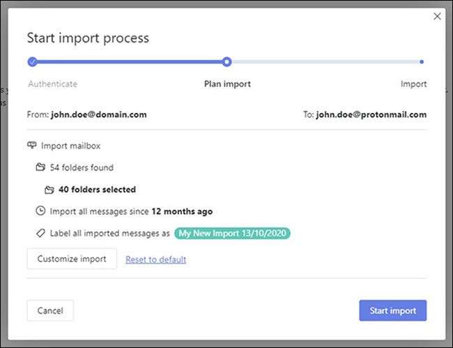 ایک بار جب آپ مستند ہو تو، پروٹون میل آپ کو بتائے گا کہ کیا درآمد کیا جائے گا. آپ مزید تبدیلیوں کو بنانے کے لئے "اپنی مرضی کے مطابق درآمد" کے بٹن پر کلک کر سکتے ہیں، جیسے تاریخوں اور فولڈرز (لیبلز) کو کاٹنے کے لئے، یا عمل شروع کرنے کے لئے "درآمد شروع کریں" کو مار ڈالو.
