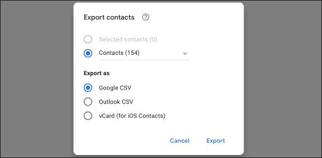 بنیادی طور پر، یہ آپ کے تمام رابطوں کو برآمد کرے گا. آپ صرف مخصوص رابطے، مرکزی فہرست سے سر پیچھے کو برآمد کرنے اور آپ کو برآمد کرنا چاہتے ہیں جس کے رابطوں کو منتخب کریں، اور پھر ایکسپورٹ صفحے پر واپس سربراہ چاہتے ہیں. "گوگل CSV" کے طور پر شکل کو چھوڑ دو اور "برآمد کریں" پر کلک CSV فائل کو ڈاؤن لوڈ کرنے کے لئے.