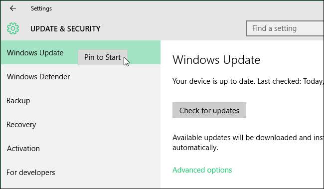 نوٹ کریں کہ مائیکرو سافٹ نے آپ کی ترتیبات کو پچھلی تعمیرات سے اسٹارٹ مینو میں تبدیل کرنے کا طریقہ تبدیل کردیا ہے۔ ہر ایک ترتیبات کی سکرین پر سرچ باکس کے بائیں طرف تھمبٹیک ہوتا تھا جس کی مدد سے آپ اسٹارٹ مینو میں سیٹنگ کو پن سے محفوظ کرسکتے ہیں۔