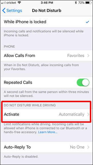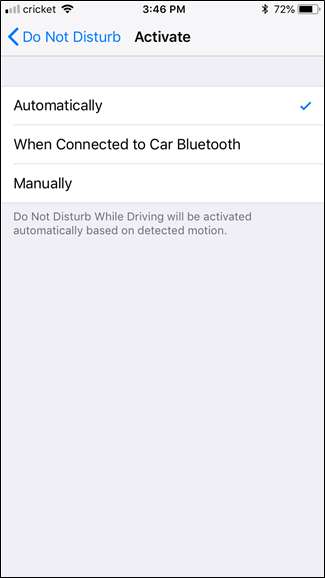 ڈسٹرب نہ کریں صفحہ کے نیچے سکرول کریں ، اور پھر "ڈرائیونگ کے دوران پریشان نہ ہوں" مینو میں جائیں۔ یہاں تین اختیارات ہیں: خود کار طریقے سے ، جب کار بلوٹوتھ سے منسلک ہوں ، یا دستی طور پر۔ آپ کی صورتحال میں سے جو بھی انتخاب کریں۔