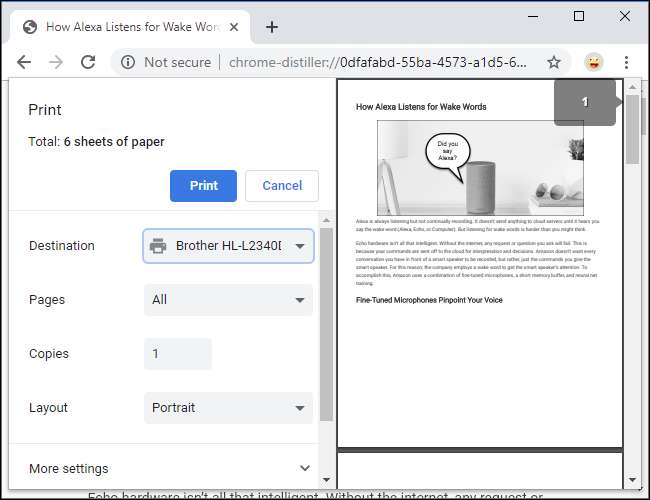 اپنے براؤزر میں ریڈنگ موڈ کو فعال کرنے کے بعد ، اس کا مینو کھولیں اور عام کی طرح ہی "پرنٹ" پر کلک کریں۔ یہ ویب صفحے کے ہموار ، زیادہ کم ورژن کو پرنٹ کرتا ہے۔ یہ کٹ ڈاؤن ورژن پرنٹ پیش نظارہ ونڈو میں بھی ظاہر ہوتا ہے۔