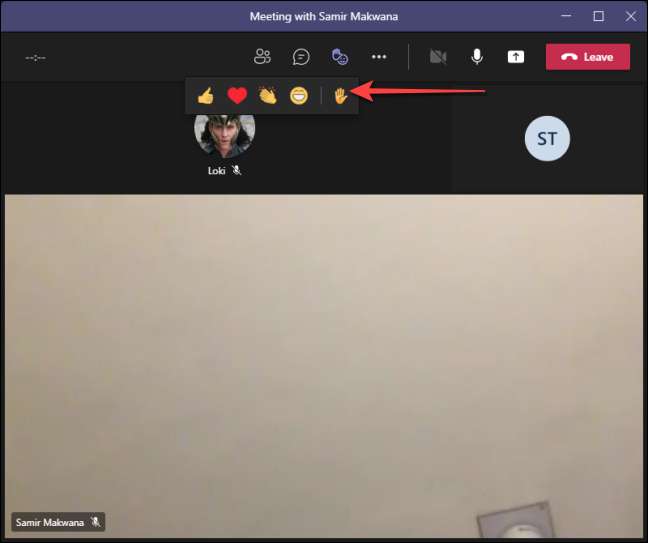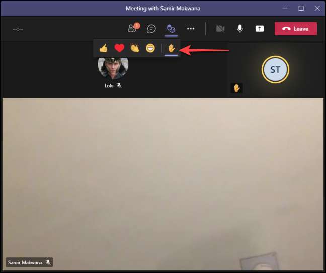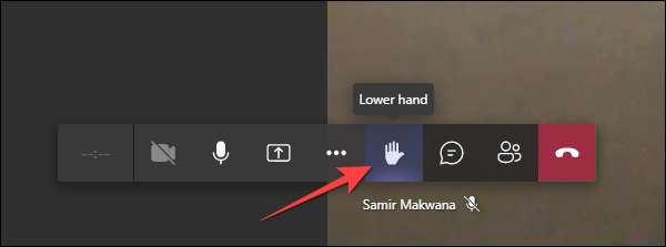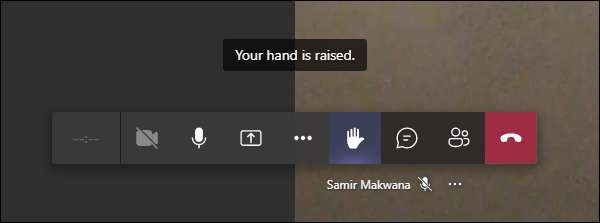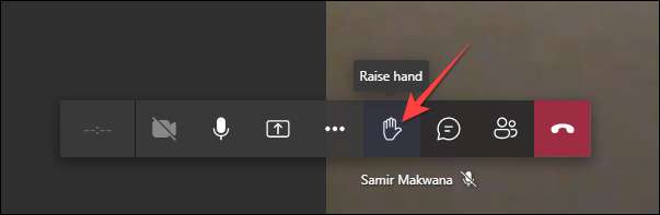 تم ایک تیرتے بار ویڈیو کال کی سکرین کے سب سے اوپر دائیں کونے میں طے دیکھنا چاہیئے. سب سے اوپر "ردعمل دکھائیں" بٹن پر مائیکروسافٹ ٹیمیں ایپ میں ایک جاری کال، ہور ماؤس کے دوران آپ کے ہاتھ اٹھانے اور "بلند ہاتھ" کے بٹن کو منتخب کرنے کے لئے. یا، آپ کے لئے Ctrl دبائیں + فوری طور پر ایک ہی عمل انجام دینے + K شفٹ کر سکتے ہیں.