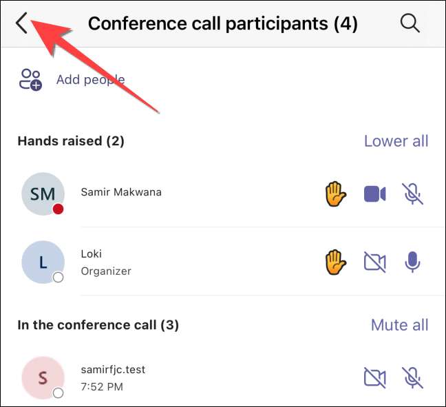 جب کالم کھولتا ہے تو، آپ شراکت دار کا نام اس کے آگے ایک ہاتھ emoji کے ساتھ دیکھیں گے، اس ترتیب میں ظاہر ہوتا ہے جس میں انہوں نے اپنا ہاتھ اٹھایا. "شرکاء" مینو کو بند کرنے کے لئے، اسکرین کے سب سے اوپر بائیں کونے میں بائیں تیر پر ٹپ کریں.