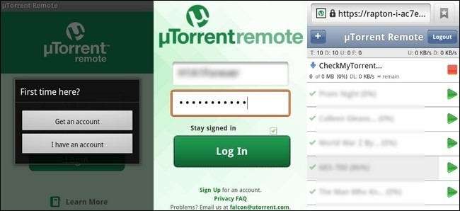 یوٹورینٹ ریموٹ سسٹم کا استعمال کرتے ہوئے دور سے اپنے یوٹورینٹ کلائنٹ سے رابطہ قائم کرنے کے ل desktop اپنے ڈیسک ٹاپ یا موبائل براؤزر کی طرف صرف اسی طرف اشارہ کریں۔ ہتتپس://ریموٹ.عتوررینٹ.کوم/ . آپ کے پہلے دورے پر یہ آپ کو ایک اکاؤنٹ بنانے کا اشارہ کرے گا (آپ "میرا اکاؤنٹ ہے" پر کلک کرنا چاہتے ہیں کیوں کہ ہم نے ابھی ہی یوٹورنٹ کلائنٹ میں ایک تشکیل دیا ہے) ، پھر — جیسا کہ اوپر اسکرین شاٹ کے وسط میں دیکھا جاسکتا ہے - آپ بنیں گے ایک سادہ لاگ ان اسکرین کے ساتھ مبارک ہو۔ پچھلے مرحلے میں جو کمپیوٹر نام اور پاس ورڈ آپ نے بنایا ہے اس کا استعمال کرکے لاگ ان کریں اگر آپ موبائل براؤزر استعمال کر رہے ہیں تو آپ کو پچھلے پینل میں دکھائے جانے والا آئی فون کی خوبصورتی والا انٹرفیس ملتا ہے۔ اگر آپ کسی ڈیسک ٹاپ براؤزر سے لاگ ان ہوجاتے ہیں تو آپ کو یوٹورنٹ انٹرفیس سے ملتا جلتا نظر آتا ہے (لیکن پھر بھی آسان بنایا جاتا ہے) جسے آپ گھر پر دیکھیں گے۔