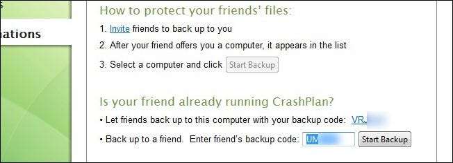 یہاں آپ اپنا بیک اپ کوڈ (کسی ایسے دوست کے ساتھ شئیر کرنے کے ل. جو آپ کے کمپیوٹر میں بیک اپ بنانا چاہتا ہے) یا اس کوڈ میں پلگ ان حاصل کرسکتے ہیں جس نے آپ کو بھیجا ہے۔ ہم فرض کریں گے کہ آپ نے اپنے دوست یا رشتہ دار کے ساتھ بیک اپ شیئرنگ کا منصوبہ پہلے ہی صاف کر لیا ہے اور ان کا کوڈ ہاتھ میں ہے (اور اس طرح دعوت نامے کو چھوڑ سکتے ہیں)۔