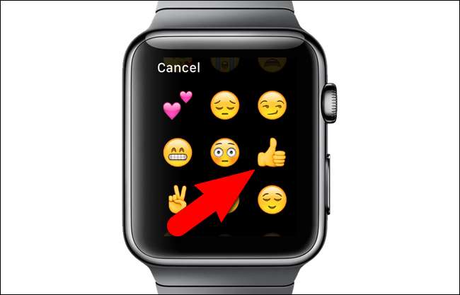 ایموجیز کے ذریعے سکرول کرنے کیلئے ڈیجیٹل کراؤن سوائپ یا موڑ دیں۔ جب آپ کو کوئی ایسی چیز مل جاتی ہے جسے آپ استعمال کرنا چاہتے ہیں تو اس پر تھپتھپائیں۔ مثال کے طور پر ، ہم انگوٹھوں والے ایموجی کے ساتھ جواب دیں گے۔