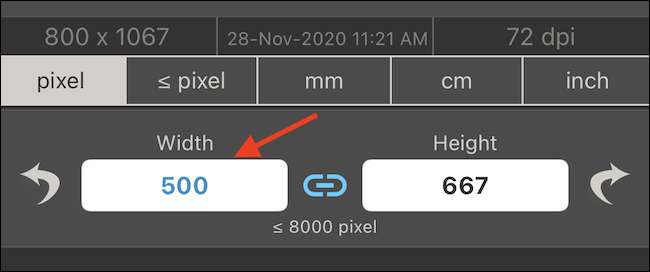 اب آپ ایڈیٹر میں تصویر دیکھیں گے. "پکسل" سیکشن میں، تصویر کا سائز تبدیل کرنے کے لئے "چوڑائی" یا "اونچائی" کو تبدیل کریں (اس بات کو یقینی بنائیں کہ وسط میں بٹن جس میں ایک سلسلہ لنک کی طرح لگتا ہے اس کو فعال کیا جاتا ہے تاکہ پہلو تناسب اسی طرح رہیں.).