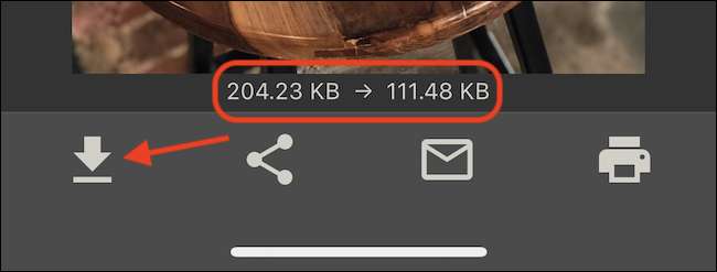 اے پی پی نئی، دوبارہ تبدیل کردہ تصویر کے فائل کا سائز دکھائے گا. ایک بار جب آپ خوش ہوں تو، محفوظ کریں بٹن کو ٹیپ کریں (جو اسکرین کے نچلے حصے میں ٹول بار میں اس کے نیچے ایک لائن کے ساتھ ایک نیچے کی طرف اشارہ تیر کی طرح لگ رہا ہے).