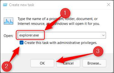 نیا کام ونڈو تخلیق کریں گے. کھولنے کے بعد متن باکس میں "ایکسپلورر.یکس" ٹائپ کریں، "اس کام کو انتظامی استحکام کے ساتھ تخلیق کریں،" اور پھر "ٹھیک" پر کلک کریں.