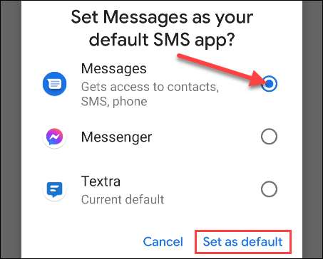 اگلے اسکرین یا پاپ اپ پر، "پیغامات" کو منتخب کریں اور "ڈیفالٹ کے طور پر مقرر کریں."