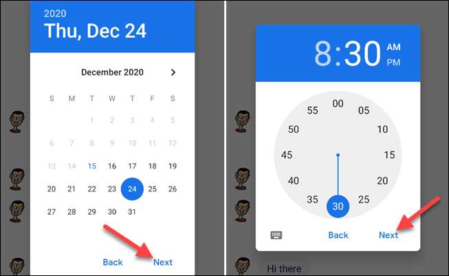 اگر آپ اپنی مرضی کے مطابق تاریخ اور وقت منتخب کرتے ہیں، تو آپ کو کیلنڈر سے تاریخ لینے اور ایک وقت منتخب کرنے کے لئے کہا جائے گا. ختم ہونے پر "اگلا" ٹیپ کریں.