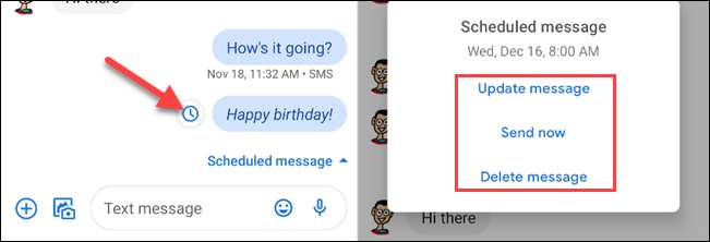اب آپ بات چیت میں شیڈول شدہ پیغام دیکھیں گے. پیغام متن یا شیڈول وقت کو تبدیل کرنے کے لئے گھڑی آئکن کو تھپتھپائیں، ابھی ابھی بھیجیں، یا مکمل طور پر پیغام حذف کریں.