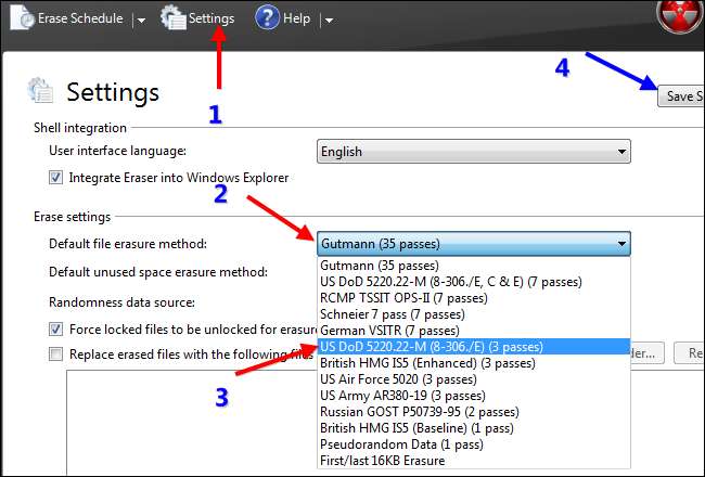 صرف ایریسر کے ڈیسک ٹاپ آئیکون پر ڈبل کلک کریں اور "ترتیبات" پر کلک کریں۔ مٹانے والی ترتیب کو تبدیل کریں ، اور پھر "سیٹنگیں محفوظ کریں" کے بٹن کو دبائیں۔