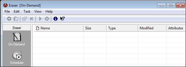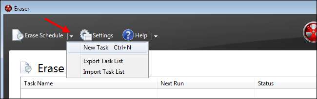 ایک بار جب آپ نے ایریزر کو انسٹال کرلیا تو ، پروگرام کو چلانے کے لئے ڈیسک ٹاپ کے آئیکون پر صرف ڈبل کلک کریں۔ پہلی اسکرین جو آپ دیکھ رہے ہیں وہ مٹانے کا شیڈول ہے۔ اگر آپ اوپر والے تیر پر کلک کرتے ہیں تو ، آپ نئے ٹاسک تشکیل دے سکتے ہیں اور ٹاسک لسٹ کو امپورٹ یا ایکسپورٹ کرسکتے ہیں۔